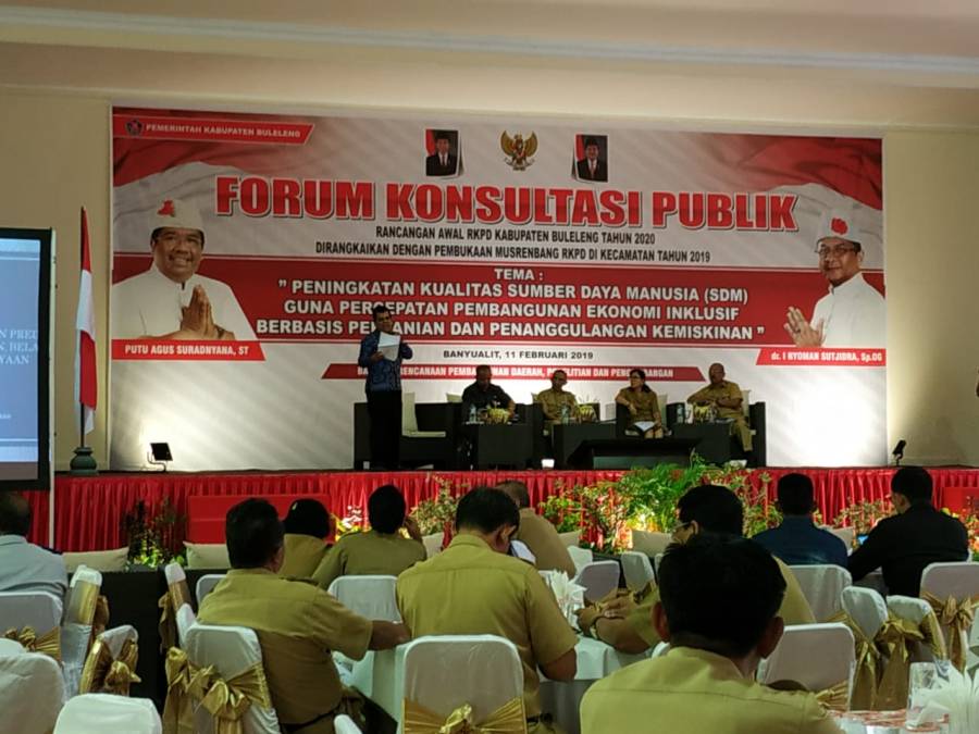 Senin, 11 Pebruari 2109 bertempat Banyualit Resort and spa dilaksanakan Kegiatan Konsultasi Publik Rancangan Awal Rencana Kegiatan Pemerintah Daerah (RKPD) Kabupaten Buleleng tahun 2020, dirangkaikan Pembukaan Musrenbang RKPD di Tingkat Kecamatan Tahun 2019.