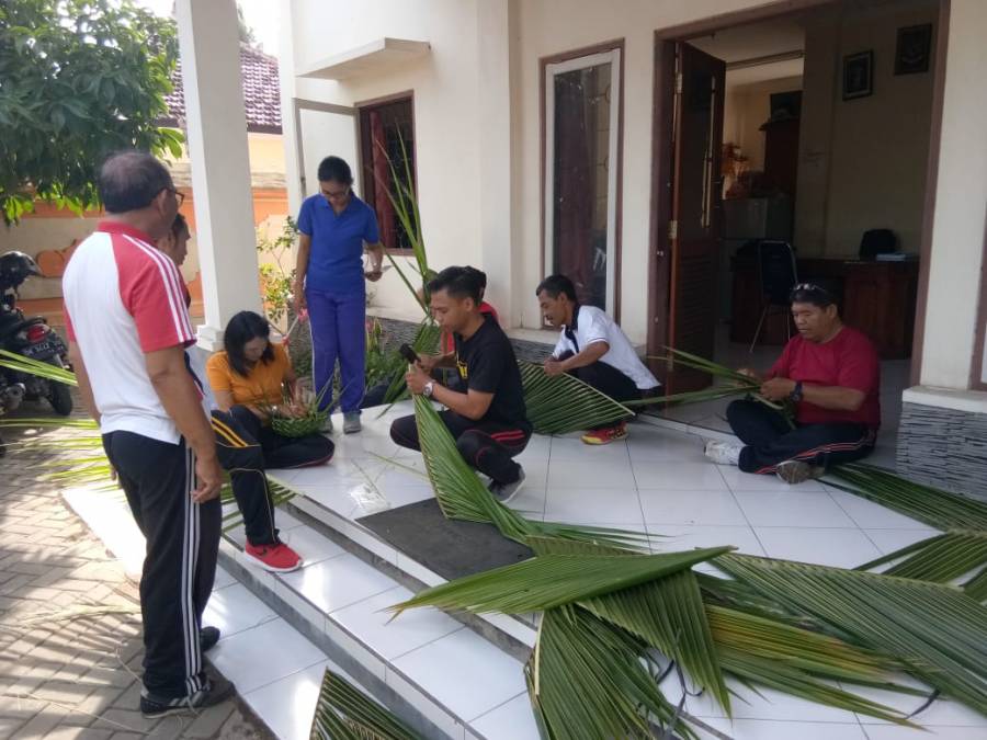 Menganyam daun kelapa merupakan kerajinan tangan yang membutuhkan kesabaran. Daun kelapa yang ada disekitar kita biasanya hanya digunakan untuk canang sari atau banten, sekarang dibuat kerajinan tangan berupa topi dan wadah buah. Dengan membuat anyaman ini diharapkan memberikan kreativitas baru bagi pegawai BPP Banjar.