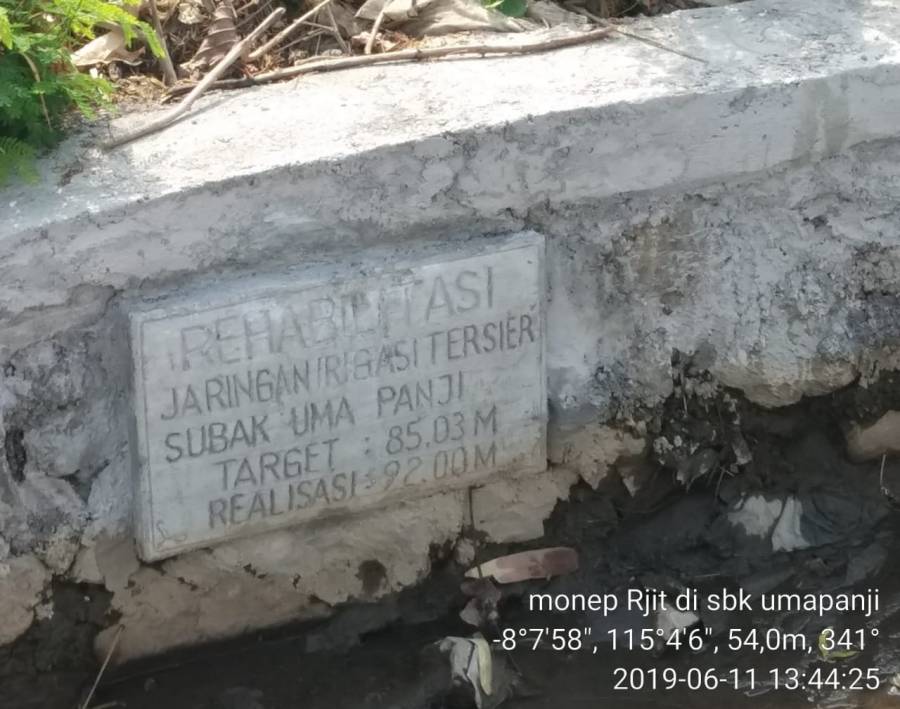 Pengerjaan jaringan irigasi dilakukan oleh anggota subak selama kurang lebih 16 hari dan selesai pada hari kamis, 30 mei 2019. Dengan adanya bantuan rehabilitasi jaringan irigasi ini diharapkan dapat membantu petani dalam memaksimalkan pengairan di sawah sehingga dapat meningkatkan intensitas penanaman padi di subak uma panji.