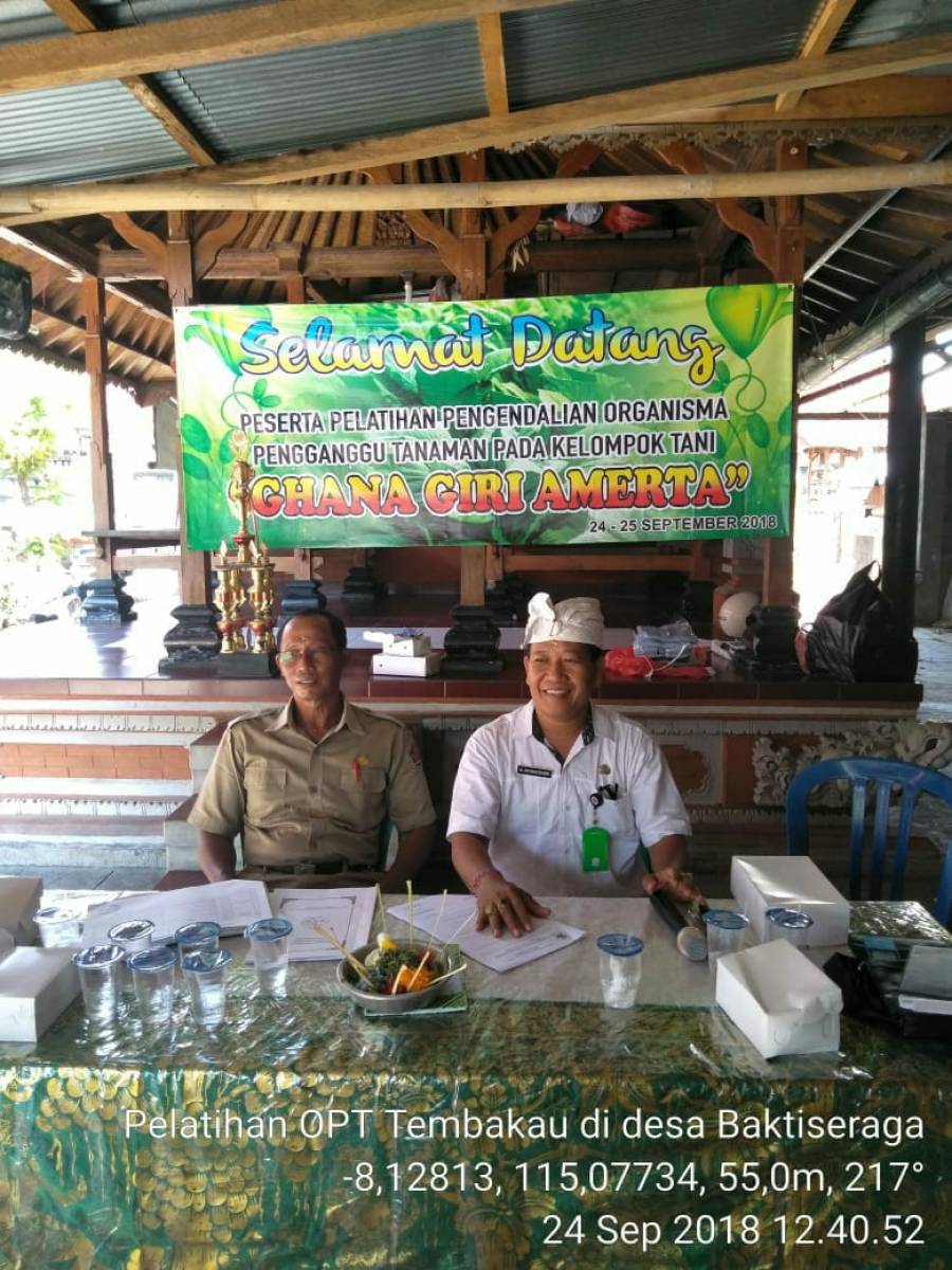 Senin, 24 September 2018, di Kelompok Ghana Giri Amertha, Desa Baktiseraga Kecamatan Buleleng diadakan pembinaan terkait organisme pengganggu tanaman tembakau. Kegiatan tersebut dihadiri oleh drh. I Gusti Bagus Oka Yadnya selaku koordinator BPP Buleleng dan Made Mangku selaku PPL wilbin Baktiseraga.