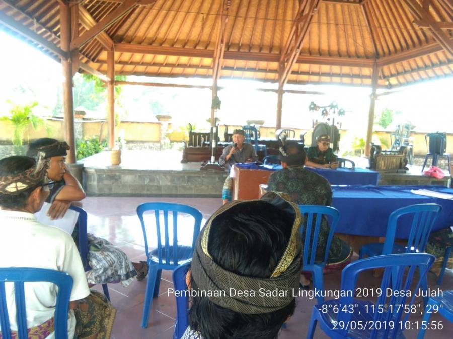 Menindaklanjuti Surat dari Kecamatan Tejakula Nomor 660/281/2019, Perihal Pembinaan Desa Sadar Lingkungan Tahun 2019, yang ditujukan kepada Koordinator BPP Tejakula pada tanggal 27 Mei 2019, maka pada hari ini Rabu 29 Mei 2019 dilakukan kegiatan pembinaan yang bertempat di Aula Kantor Desa Julah. Turut hadir Tim Pembina dari Kecamatan Tejakula, Keliang Desa Pakraman Julah, Perbekel Desa Julah, Penjuru Adat, Tim Pendamping masing-masing Aspek yang di perlombakan, Koordinator BPP Tejakula dan PPL Wilbin Desa Julah. Tujuan dari pembinaan ini yaitu untuk mematangkan kesiapan Desa Julah untuk mengikuti lomba Desa Sadar Lingkungan 2019 tingkat Kabupaten Buleleng yang akan dilaksanakan pada tanggal 26 Juni 2019.