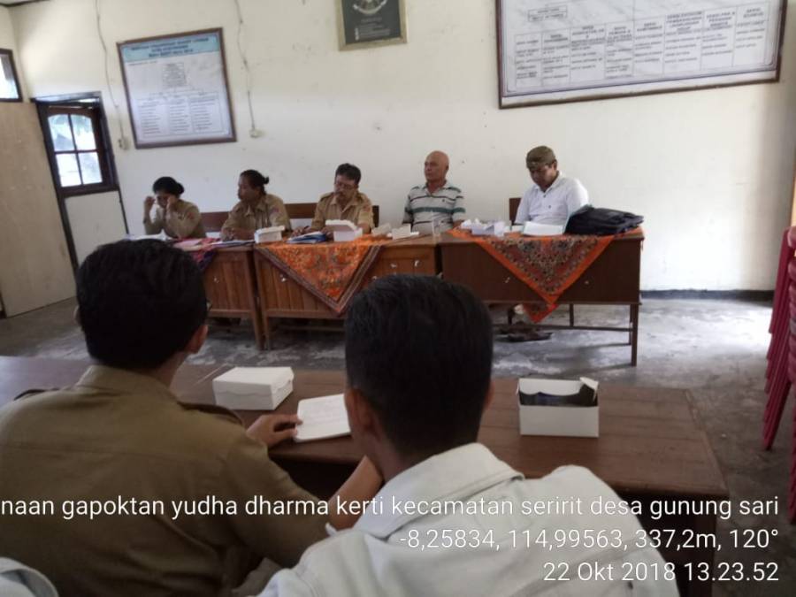 Pada hari Senin, tanggal 22 Oktober 2018, Tim dari Dinas Pertanian Kabupaten Buleleng mengadakan rapat “Pembinaan Gapoktan Yadha Dharma Kerti” di desa Gunung Sari, Kecamatan Seririt Kabupaten Buleleng. Adapun peserta yang menghadiri rapat tersebut adalah Bapak Ketut Suwartana, S.Pt selaku Kasi Pembiayaan dan Investasi, Perwakilan dari Dinas Pertanian, Staf Bidang PSP Bapak Ir. Ketut Putrayasa, PPL Wilbin Desa Gunung Sari beserta Pengurus Gapoktan dan Poktan wilayah tersebut.
