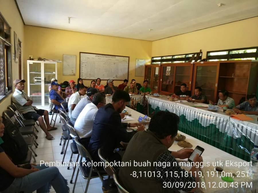 Minggu,30 september 2018 telah dilaksanakan pembinaan kelompok tani buah naga dan manggis untuk sertifikasi mendukung ekspor,kegiatan yang dilaksanakan di BPP Kubutambahan,Kecamatan Kubutambahan yang dihadiri oleh: Kadis Pertanian Kabupaten Buleleng,Prof.Alit Susanto Wirya (UNUD), Prof. Made Utama selaku ketua Komoditi Deplopment Program, Ibu Dayu perwakilan dari dinas provinsi,Bapak Wayan Muliarta dan Bapak Agung sebagai pelaku usaha,serta dihadiri oleh petani buah naga dan manggis.