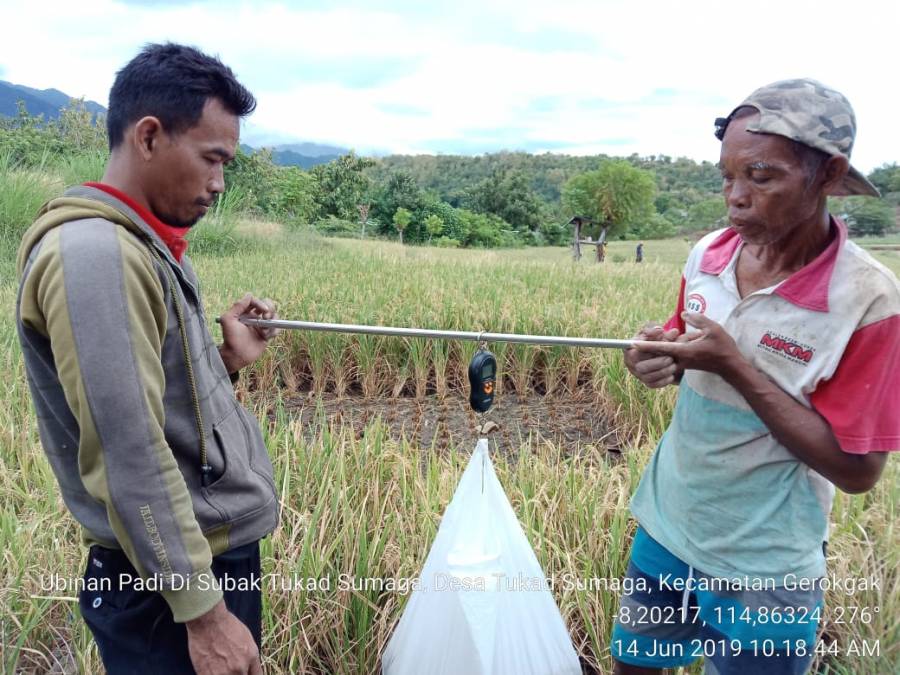 Pengambilan data produktivitas padi dengan cara ubinan dilakukan pada Jumat, 14 Juni 2019 di Subak Tukad Sumaga, Desa Tukad Sumaga, Kecamatan Gerokgak, Kabupaten Buleleng. Pengambilan ubinan ini bertujuan untuk memperoleh data produktivitas suatu tanaman. Kegiatan ini dilaksanakan oleh Mantri Tani, PPL Wilbin Tukad Sumaga dan Pembantu Mantri Tani. Pemilik lahan lokasi ubinan ini adalah Putu Merta.