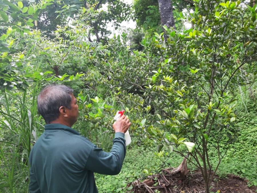 Keberadaan penyakit inilah yang membuat resah petani jeruk di Desa Penuktukan atas nama Pak Nyoman. Seperti yang diberitakan sebelumnya, bahwa keberadaan penyakit dan serangga ini sangat mengganggu dan menimbulkan kerusakan daun pada tanaman jeruk yang dimilikinya. Oleh sebab itu pada hari ini, Kamis, 18 April 2019 petugas pengamat hama dan penyakit wil. Kec. Tejakula mendatangi dan melakukan pengendalian bersama petani di pertanaman jeruk yang dimiliki. Dikarenakan wawancara pada petani bahwa keberadaan penyakit dan hama ini sudah mencapai ambang batas ekonomi dengan intesitas serangan sebesar 60% dan dianggap meresahkan petani maka pengendalian maka yang dilakukan yaitu dengan pemberian insektisida organik yaitu Merk dagang Antilat. Pemberian insektisida ini menggunakan dosis satu sendok makan/ 10 liter air.