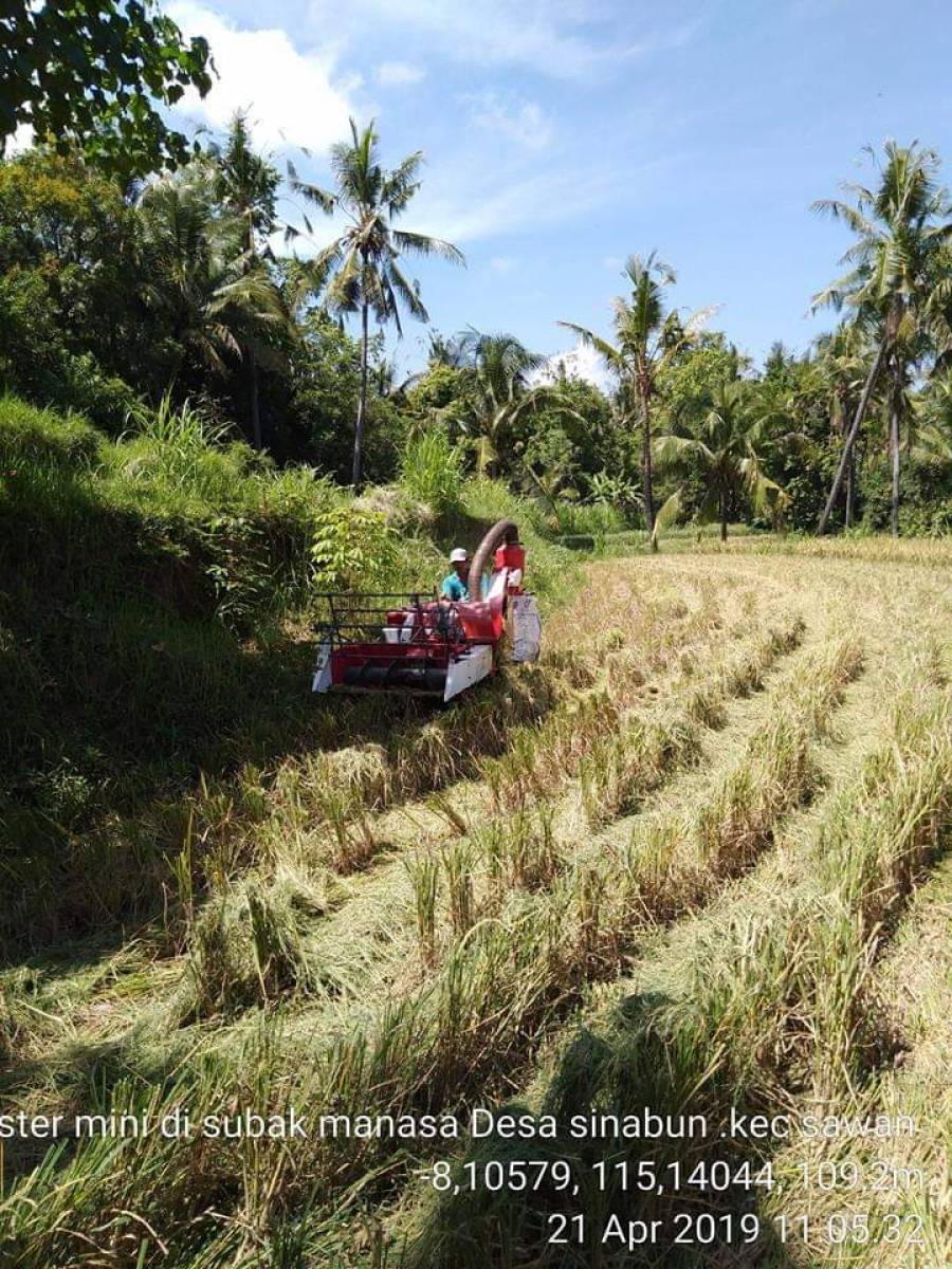 Minggu (21/4) dilakukan Panen di Subak Menasa, Desa Sinabun Kecamatan Sawan. Panen ini juga melibatkan peran UPJA yang dimana pelayanan jasa Alsintan mencakup penanganan kegiatan budidaya seperti jasa penyiapan lahan dan pengolahan tanah, pemberian air irigasi, penanaman, pemeliharaan; Perlindungan tanaman termasuk pengendalian kebakaran. Pelayanan jasa Alsintan dalam penanganan panen, pasca panen dan pengolahan hasil pertanian seperti jasa pemanenan, perontokan, pengeringan dan penggilingan padi.
