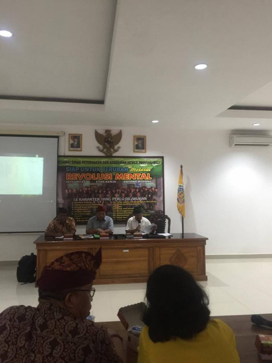 Adapun yang hadir dalam Rapat :1. Kepala Bidang Perbibitan dan Produksi Peternakan Dinas Peternakan dan Kesehatan Hewan Provinsi Bali2. Kepala Bidang Peternakan dan Penyuluhan yang menangani fungsi Peternakan Kabupaten se-Bali3. BPTP Provinsi Bali4. Fakultas Peternakan Universitas Udayana5. Petugas Koordinator IB, PKB, dan DE SIWAB se-Bali