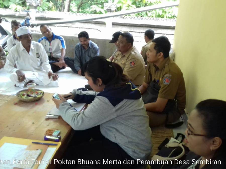 Acara Penyerahan Kartu Tani di Poktan Bhuana Kertha dan Perambuan Desa Sembiran, Senin 18 Maret 2019 pkl 10.00 Wita di Balai Poktan Bhuana Kertha Desa Sembiran di hadiri oleh Petugas dari Dinas Pertanian Kabupaten Buleleng, BNI Cabang Singaraja, Koordinator, PPL, Babinsa, Babinkamtibmas dan Pengurus dan anggota kedua poktan.
