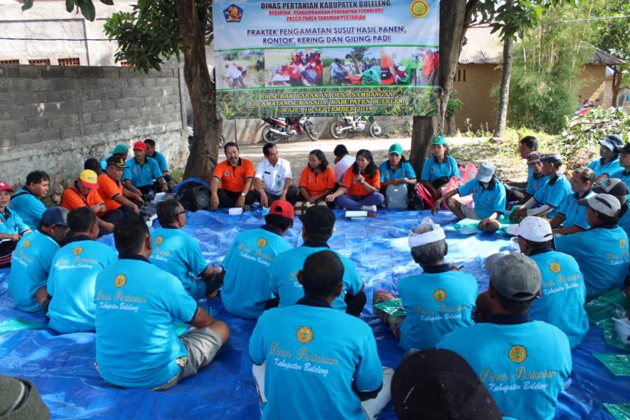 Pengamatan susut produksi padi/looses panen padi di Subak Sambangan, tanggal 19 September 2018, yang dihadiri oleh Ibu Ir. Made Lely Nurhayati Kepala Bidang Penyuluhan yang mewakili Kepala Dinas Pertanian Kabupaten Buleleng, Bapak Ir. Nyoman Liper Selaku Balai Pengawasan Serifikasi Benih Provinsi Bali. Kasi Pengolahan dan Pemasaran Tanaman Pangan Bapak Madiono, SP., Kasi Perbenihan dan Perlindungan Tanaman Pangan Bapak Putu Naya, Penyuluh Pertanian Madya Ibu Ir. Putu Suastini, M.Si., dan petugas penyuluh se-Kecamatan Sukasada serta Para undangan Kelian subak dan Anggota Subak di Subak Sambangan.