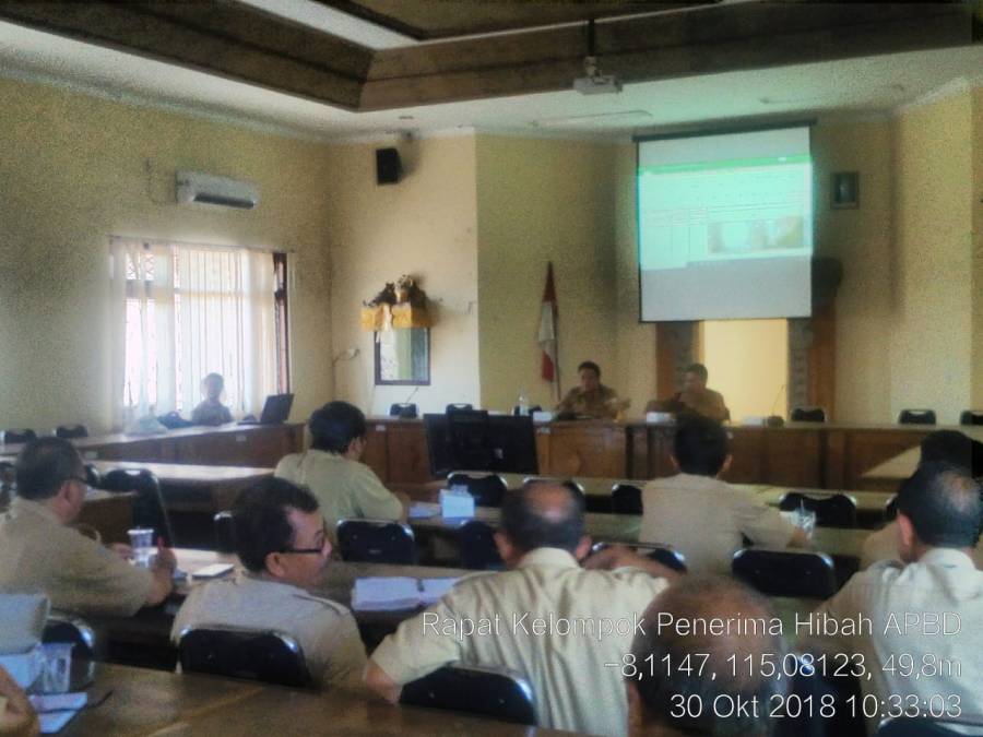 Selasa,30 Oktober 2018 di Ruang Pertemuan Dinas Pertanian Kab.Buleleng diadakan Rapat Evaluasi Kegiatan Penerima Hibah Tahun 2018.Rapat dipimpin oleh Kepala Bid.PSP Bpk Drh.Gde Arya Citra yang didampingi Kasi Lahan dan Irigasi Bpk Ida Putu Sandiasa,SP yg skaligus akan lebih banyak memberikan arahan terkait pelaksanaan kegiatan penerima hibah Tahun 2018.Peserta rapat diantaranya: Koordinator Kecamatan Se-Kabupaten Buleleng, Mantri Tani Kecamatan Se-Kab.Buleleng, PPL Wilbin Ds.Bukti, Ds.Kubutambahan, Ds.Menyali, Ds.Kedis, Ds.Tukadsumaga, Ds.Patas, Ds.Banyupoh, Ds.Sumberkima, Desa Pejarakan dan juga dihadiri pula oleh gapoktan dan Kelompok Tani/Ternak penerima dana hibah Tahun 2018 masing2 2 orang.