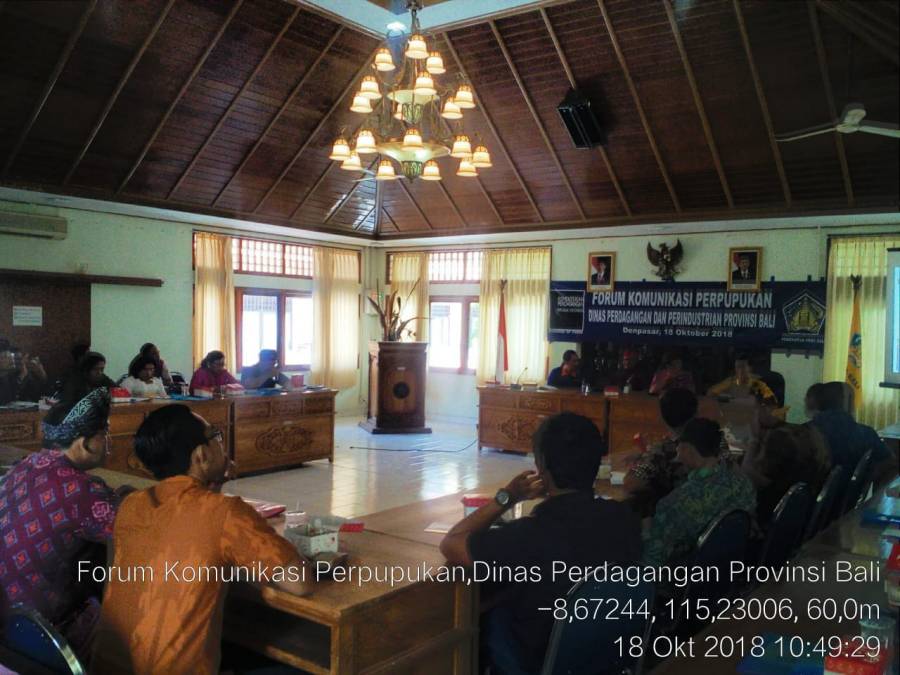 Kamis, 18 Oktober 2018 Dinas Perdagangan dan Perindustrian Provinsi Bali mengadakan rapat forum komunikasi perpupukan di ruang pertemuan Dinas Perdagangan dan Perindustrian Provinsi Bali. Rapat ini dihadiri oleh seluruh Dinas Pertanian se- Provinsi Bali, yakni Dinas Pertanian Kabupaten Buleleng dihadiri oleh Kepala Bidang Prasarana dan Sarana Pertanian Kabupaten Buleleng drh. Gede Arya Citra, Dinas Perdagangan dan perindustrian se-Provinsi Bali, distributor dan kios pupuk yang ada di Provinsi Bali. Rapat tersebut di buka langsung oleh Kepala Dinas Dinas Perdagangan dan Perindutrian Ir. Putu Astawa, M.Si dan dilanjutkan dari narasumber Dinas tanaman pangan, hortikultura dan perkebunan Provinsi Bali.