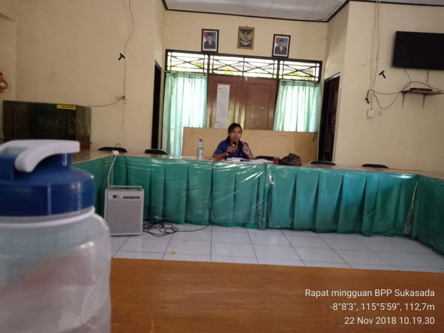 Kamis, 22 november 2018, BPP Sukasada mengadakan rapat mingguan yang dpimpin oleh Ibu Koordinator Made Sumetriani,M.P, yang dihadiri oleh POPT, Mantri Tani, PPL, serta staff TU. Rapat minggu ini membahas mengenai kegiatan monev LP2B yang akan dilaksanakan didesa Tegallinggah, Selat, dan Kayuputih, membahas mengenai odalan yang akan dilaksanakan di BPP Sukasada, membahas mengenai cara pengisian instrumen penilaian kelas kelompok.