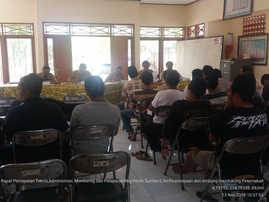 Selasa,13 Nopember 2018 di Ruang Pertemuan BPP Gerokgak Kec.Gerokgak diadakan Rapat Percepatan,Teknis, Administrasi, Monitoring dan Pelaporan Kegiatan Pembangunan Sumber-Sumber Air,Perpompaan dan Embung Mendukung Peternakan.Rapat dipimpin oleh Kasi Lahan dan Irigasi Bpk Ida Putu Sandiasa,SP yg didampingi oleh Kasi PSP Dari Dinas Peternakan dan Keswan Prov.Bali Ibu Ir.Widiawati yg skaligus akan lebih banyak memberikan arahan terkait pelaksanaan kegiatan sumber sumber air.