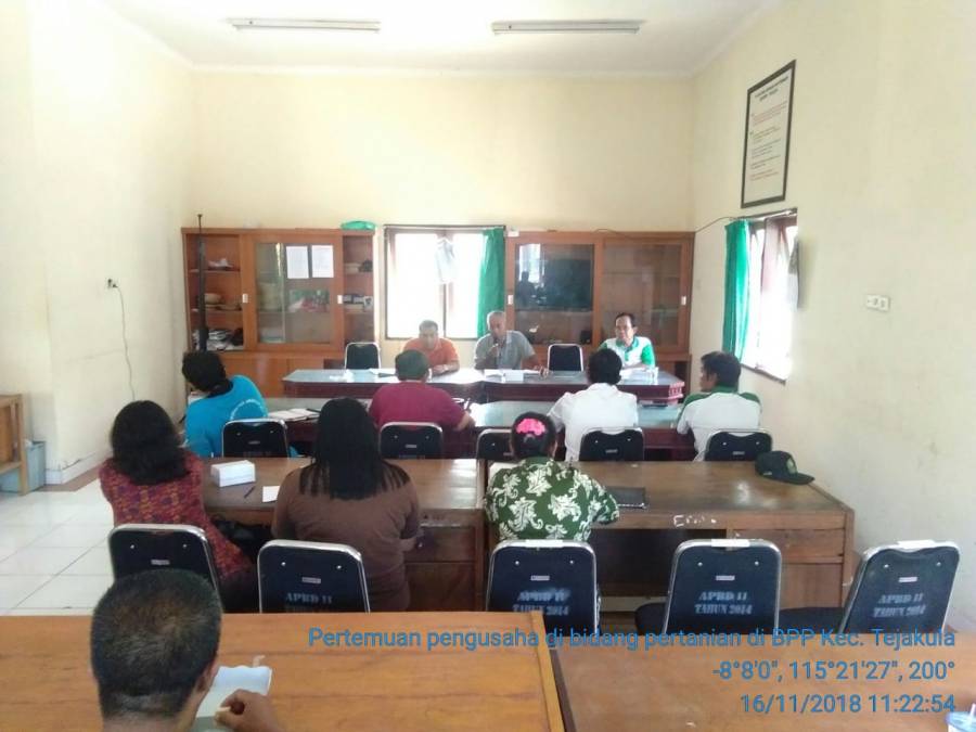 Kegiatan pertemuan ini dilaksanakan di ruang pertemuan BPP Tejakula yang mendatangkan pihak Bidang Pemasaran Distan Buleleng, petani penghasil produk pertanian serta seluruh staff BPP Tejakula.
