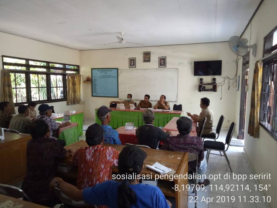 Senin 22 April 2019, Bidang Tanaman Pangan mengadakan rapat sosialisasi kewaspadaan OPT di BPP Kecamatan Seririt. Rapat tersebut dihadiri oleh Petugas Dinas Pertanian Kabupaten Buleleng, PPL dan POPT Kecamatan Seririt, serta Kelian Subak dan anggota subak di Kecamatan seririt. Tujuan dari rapat tersebut adalah untuk meningkatkan kewaspadaan petani dalam mencegah dan mengendalikan serangan OPT untuk menjaga keamanan dan peningkatan produksi tanaman pangan (padi).