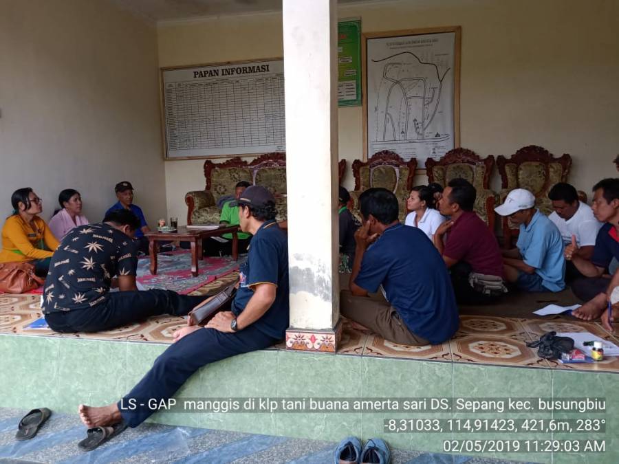 Kamis, 2 Mei 2019, belangsung Kegiatan SL-GAP Manggis di Kelompok Tani Buana Amertha Sari, Desa Sepang, Kecamatan Busungbiu. Kegiatan ini di hadiri oleh Kasi Produksi Hortikultura, PPL Wilbin dan 20 Anggota Kelompok Tani. Sekolah Lapang GAP (SL-GAP) ini merupakan media bagi petani untuk belajar memahami GAP secara mandiri.