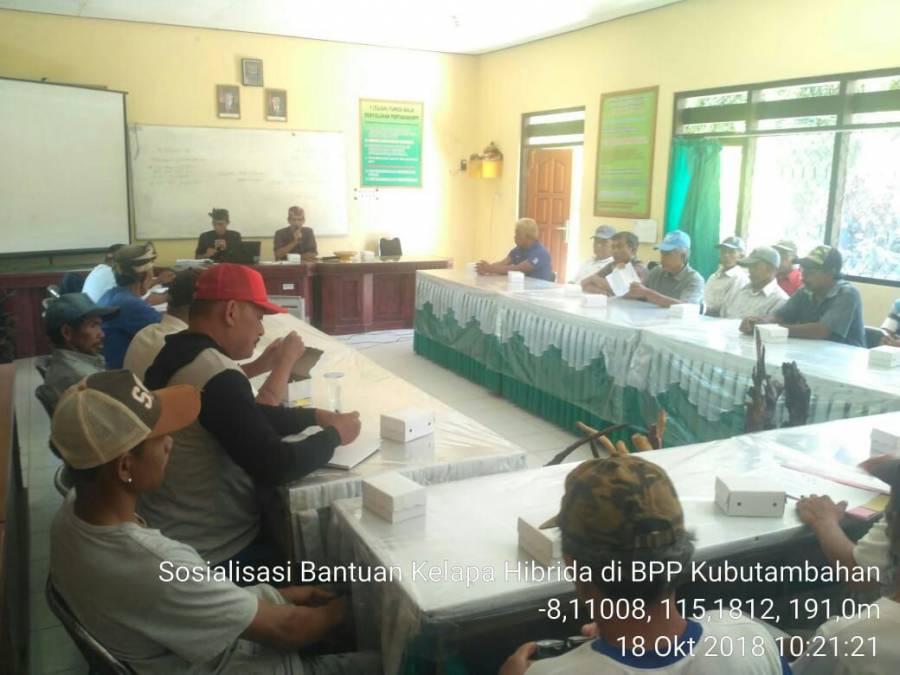 Kegiatan Sosialisasi Bantuan Kelapa Genjah/Hibrida di BPP Kubutambahan Desa Bengkala, kecamatan Kubutambahan yang dilaksanakan pada Hari Kamis, 18 Oktober 2018 oleh Tim Penyuluh Bidang Perkebunan Dinas Pertanian Kabupaten Buleleng, Kelian Subak Abian Desa Tajun, Ketua Kelompok Tani Ternak Amerta Jati (Tamblang), Pegawai BPP Kubutambahan.