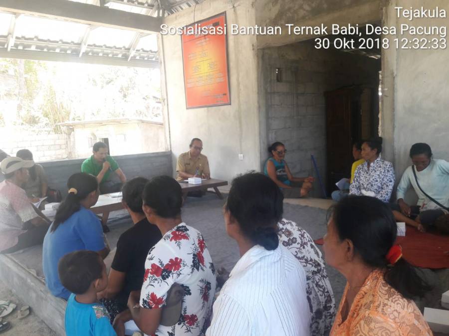 Menindak lanjuti hasil Musrenbang Desa Pacung Tahun 2018 bahwa KWT Mekar Sari, Mina sari dan Mawar Sari tersebut mengajukan Bantuan Bibit Ternak Babi maka pada hari Selasa, 30 Oktober 2018 dilaksanakannya kegiatan Sosialisasi hibah ternak babi APBD kabupaten 2018 di balai Kelompok Wanita Tani Mawar Sari Desa Pacung, Kecamatan Tejakula.