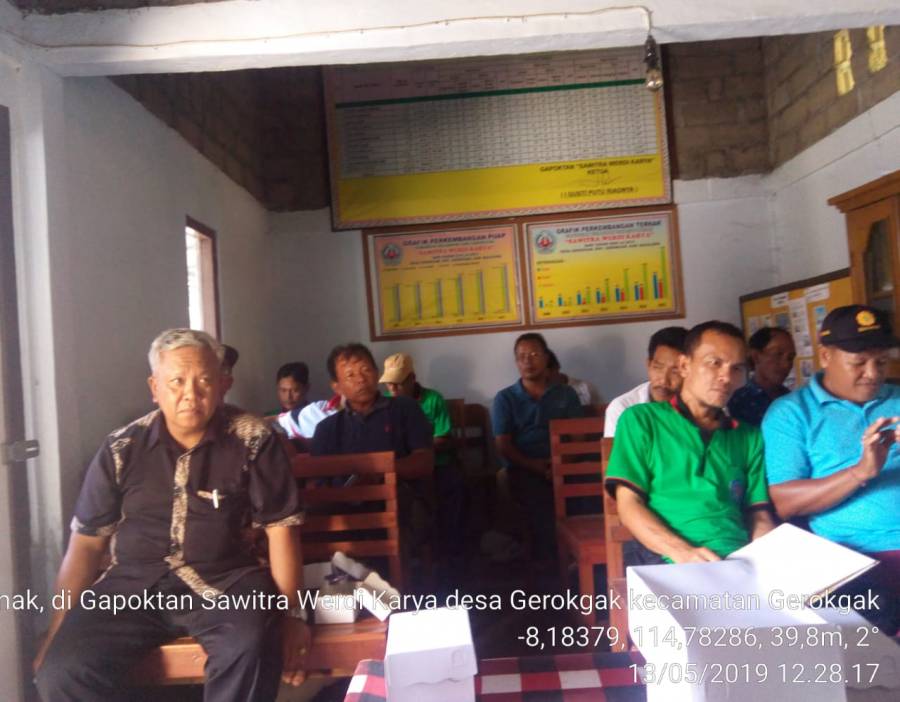 Telah berlangsung kegiatan sosialisasi hibah ternak tahun 2019 pada hari Senin, 13 Mei 2019 yang bertempat di Kelompok Ternak Gapoktan Sawitra Werdhi Mekar Desa Gerokgak Kecamatan GerokgakKegiatan ini dihadiri oleh- Tim Kabupaten- Anggota Gapoktan Sawitra Werdhi Mekar- PPL KecamatanHasil dari pertemuan ini meliputi :Hibah ternak yang diberikan berupa ternak sapi bibit betina dan bukan dalam bentuk uang, jumlah bibit sapi yang diberikan sebanyak 12 ekor sapi yang terdiri dari 10 ekor sapi bibit betina dan 2 ekor bakalan sapi bibit jantan, kelompok sebelum menerima bantuan harus membuat aturan untuk pengelolaan hibah ini karena jumlah bantuan hibah sedikit dari pada jumlah anggota sehingga harus dilakukan pengundian, realisasi hibah ternak akan dilengkapi dengan berita acara serah terima ternak dan persyaratan lainnya.