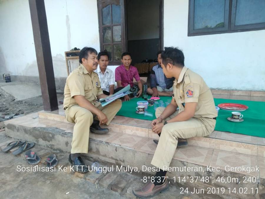 Tim Tekhnis Lahan dan Irigasi Bidang Prasarana dan Sarana Pertanian Dinas Pertanian Kabupaten Buleleng melaksanakan Sosialisasi Penyampaian Administrasi Keuangan Kegiatan Irigasi Air Tanah Dangkal yang bersumber dari dana DAK Tahun Anggaran 2019 di Kelompok Tani Ternak Unggul Mulya, Banjar Dinas Sumber Wangi, Desa Pemuteran, Kec. Gerokgak.