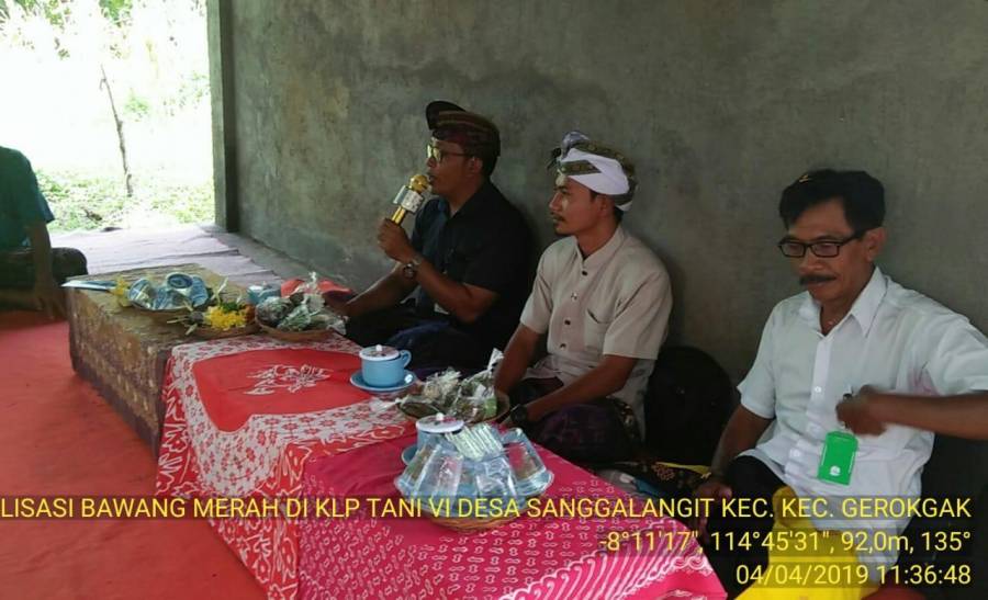 Hari kamis 4 April 2019 bertempat di Secretariat Kelompok Tani VI Desa Sanggalangit di laksanakan Sosialisasi bawang merah yg di hadiri oleh Kabid Hortikultura Distan Buleleng, aparat desa, Koordinator P2K Gerokgak, Mantri tani, POPT kecamatan Gerokgak, anggota kelompok tani VI dan Kelompok tani Putra harapan kita desa Sanggalangit. Rencana tanam bawang merah di awal bulan juni 2019. Masing masing kelompok seluas 5ha sehingga total menjadi 10 hektar. Paket bantuan pemerintah berupa benih bawang, pupuk organik, likat kuning, dan feromone.