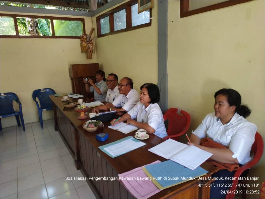 Rabu, (24/4/2019) Telah berlangsung kegiatan Sosialisasi Pengembangan Kawasan Bawang putih yang di laksanakan di Subak Munduk , Desa Munduk, Kecamatan Banjar Sosialisasi ini dihadiri oleh 20 petani, PPL Wilbin, Kabid Hoortikultura dan POPT . Dalam sosialisasi tersebut disampaikan bantuan yang akan di terima oleh petani sebanyak 3 item, diantaranya: