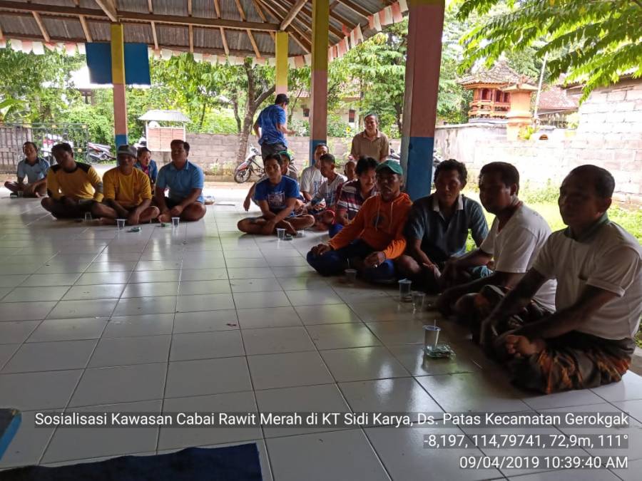 Hari ini Selasa (9/4/2019) telah berlangsung kegiatan Sosialisasi Cabai Rawit Merah yang di laksanakan di Kelompok Tani Sidi Karya, Desa Patas, Kecamatan Gerokgak. Sosialisasi ini dihadiri oleh 20 petani, PPL Wilbin, Kabid Hortikultura (I Gede Subudi, SP.) beserta Staf Hortikultura (Made Artawan, I Nyoman Balik Kariadi, dan Agung Bagus Suradarma) Tujuan diadakan sosialisai adalah untuk meningkatkan pengetahuan petani dalam pengembangan Cabai Rawit Merah, baik itu dari segi penanaman, perawatan, mengatasi hama dan penyakit, agar nantinya mampu meningkatkan produksi yang lebih baik khususnya untuk Cabai Rawit Merah.