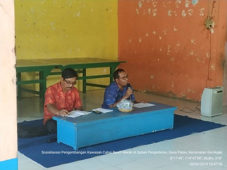 Patas. (18/4/2019)_ Telah berlangsung kegiatan Sosialisasi Cabai Rawit Merah yang di laksanakan di Subak Pengodaran, Desa Patas, Kecamatan Gerokgak. Sosialisasi ini dihadiri oleh 20 petani, PPL Wilbin, Kabid Hortikultura (I Gede Subudi, SP.) beserta Staf. Dalam sosialisasi tersebut disampaikan bantuan yang akan di terima oleh petani sebanyak 9 item, diantaranya: