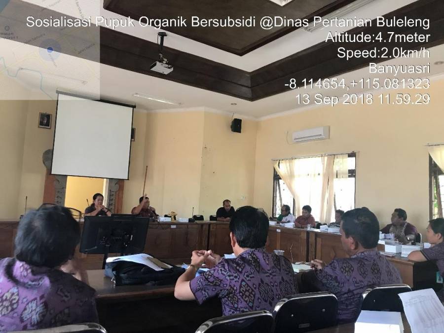 Kamis, 13 September 2018 berlangsung kegiatan sosialisasi pupuk organik bersubsidi di Dinas Pertanian Kabupaten Buleleng dipimpin oleh Kabid PSP (Prasarana dan Sarana Pertanian) drh. I Gede Arya Citra yang dihadiri oleh koordinator masing-masing BPP Kecamatan se-Kabupaten Buleleng dan produsen pupuk organik. Dalam sosialisasi ini, koordinator diperkenalkan dengan 6 (enam) produsen yang melayani subsidi pupuk organik Kabupaten Buleleng diantaranya CV. Taman Agung yang melayani subsidi pupuk organik di 18 Subak Kecamatan Busungbiu, Koperasi Tani Nandini untuk 25 Subak Kecamatan Tejakula, 15 Subak Kecamatan Kubutambahan dan 1 Subak di Kecamatan Buleleng. Gapoktan Bima Karya Bakti untuk 14 Subak di Kecamatan Gerokgak, 20 Subak di Kecamatan Banjar, 34 Subak di Kecamatan Sukasada dan 2 Subak di Kecamatan Seririt. Gapoktan Sari Bumi Rahayu untuk 22 Subak di Kecamatan Sawan. CV. Kerambitan Agro untuk 17 Subak di Kecamatan Seririt. CV. Ananta Winangun melayani 17 subak di Kecamatan Buleleng. Pupuk organik bersubsidi ini hanya untuk pajale babe (padi, jagung kedelai, bawang dan cabai)