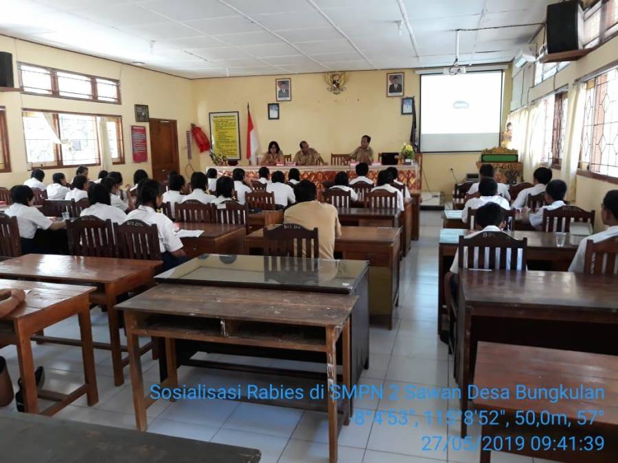 Sosialisasi Rabies di SMP No 2 Sawan Desa Bungkulan sudah dilaksanakan pada hari senin 27 Mei 2019, yang telah menjadi agenda sebelumnya. Penyampaian materi dilakukan oleh Drh Nyoman Widiarnawa selaku dokter hewan di kecamatan Sawan yang didampingi oleh PPL Wilbin kecamatan sawan. Sosialisasi bertujuan untuk memberikan arahan pada masyarakat tentang rabies, bahaya dari rabies dan cara penanganan secara cepat jika ada gigitan yang terjadi.