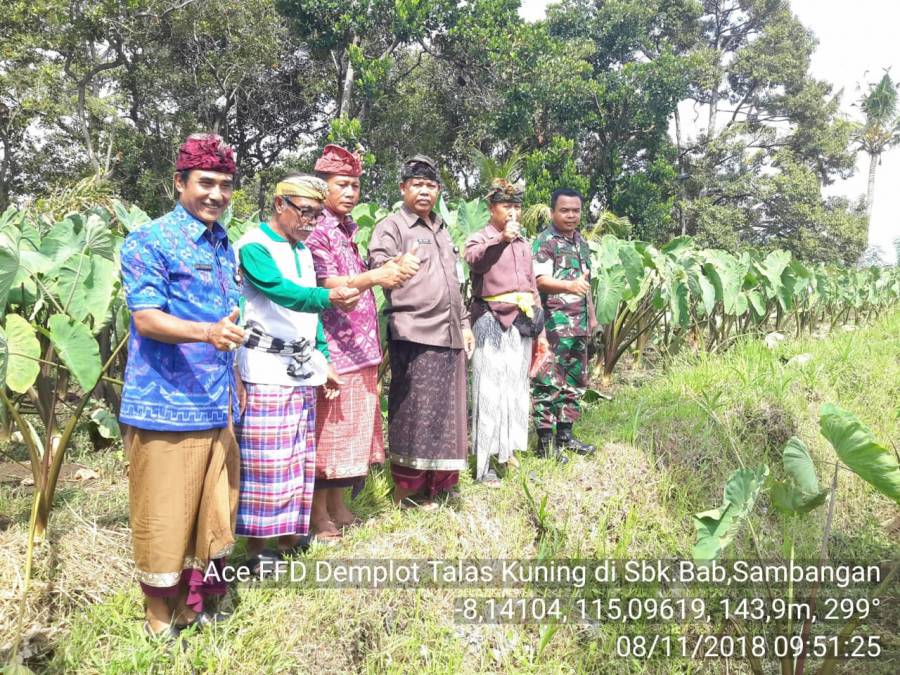 Demplot Talas Kuning yang berlokasi di Subak Babakan Sambangan Desa Sambangan, Kecamatan Buleleng. Kamis, 8 Nopember 2018, yang dihadiri oleh Kepala Dinas Pertanian Kabupaten Buleleng, Kepala Bidang Tanaman Pangan, Kepala Bidang Penyuluhan, Kepala Bidang Prasarana dan Sarana Pertanian (PSP), Kasi Produksi Tanaman Pangan, Kasi Perbenihan dan Perlindungan Tanaman Pangan, BPSB Provinsi Bali, PP Madya Dinas Pertanian, Kasi Pengolahan dan Pemasaran Tanaman Pangan, dan Koordinator Petugas Kecamatan, Mantri Tani, POPT, PPL, Perwakilan Camat Sukasada, Babinsa di Sukasada, serta undangan Para Anggota Subak Babakan Sambangan bersama Pengurus Subak, Kelian Subak Desa Panji dan Kelian Subak Desa Sambangan.