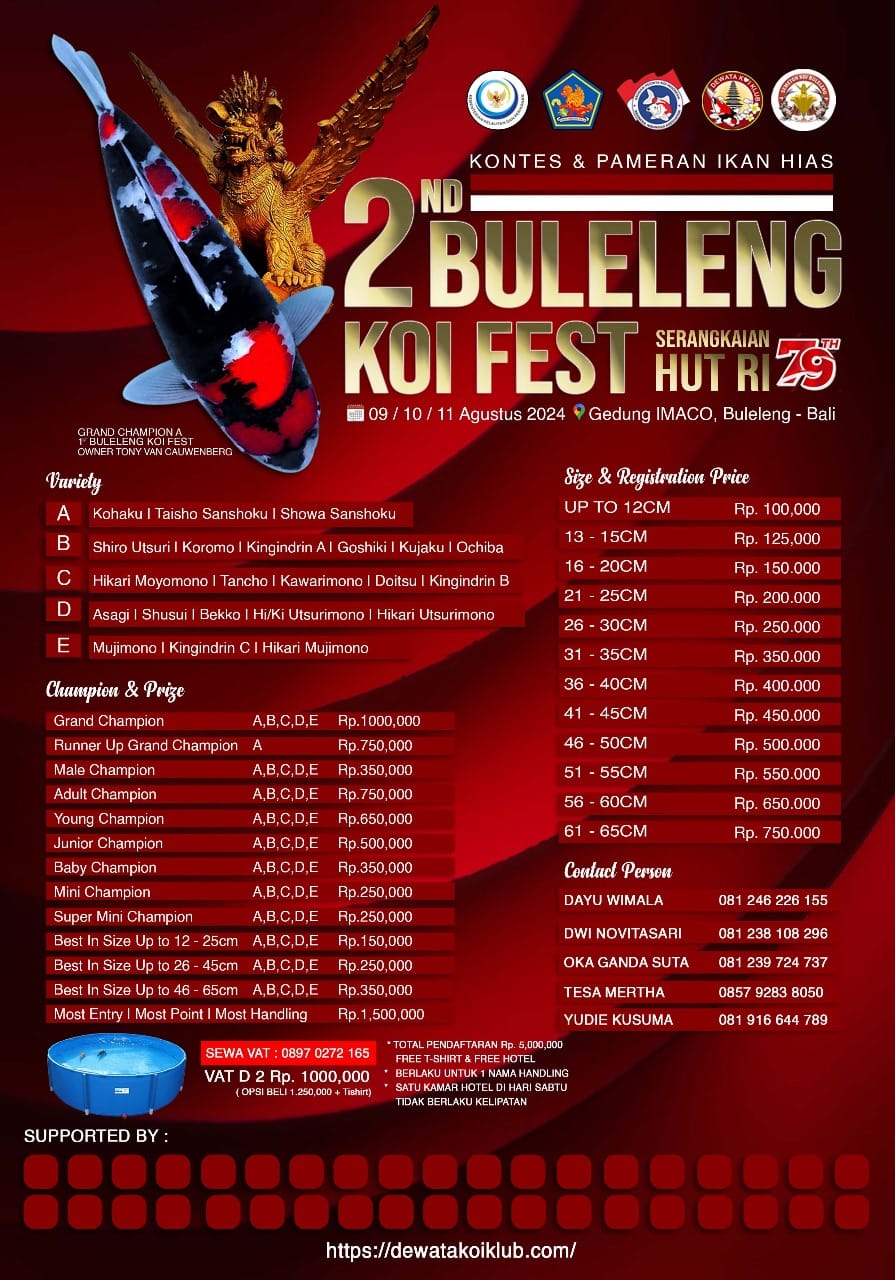 Dalam serangkaian peringatan HUT ke-79 Republik Indonesia, merupakan hasil kolaborasi antara Pemkab Buleleng melalui Dinas Ketahanan Pangan dan Perikanan (DKPP) bersama Semeton Koi Buleleng, Dewata Koi Klub, dan Asosiasi Pecinta Koi Indonesia.