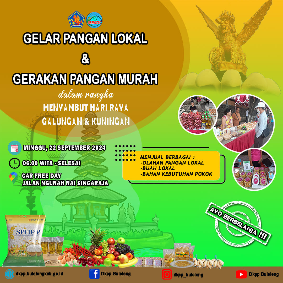 DALAM RANGKA MENYAMBUT RAHINA GALUNGAN & KUNINGAN, Pemerintah Kabupaten Buleleng melalui Dinas Ketahanan Pangan dan Perikanan (DKPP) mengadakan Gelar Pangan Lokal (GPL) & Gerakan Pangan Murah (GPM) bertempat di Jalan Ngurah Rai (depan Taman Kota Singaraja) Minggu, 22 September 2024 mulai jam 6 pagi.