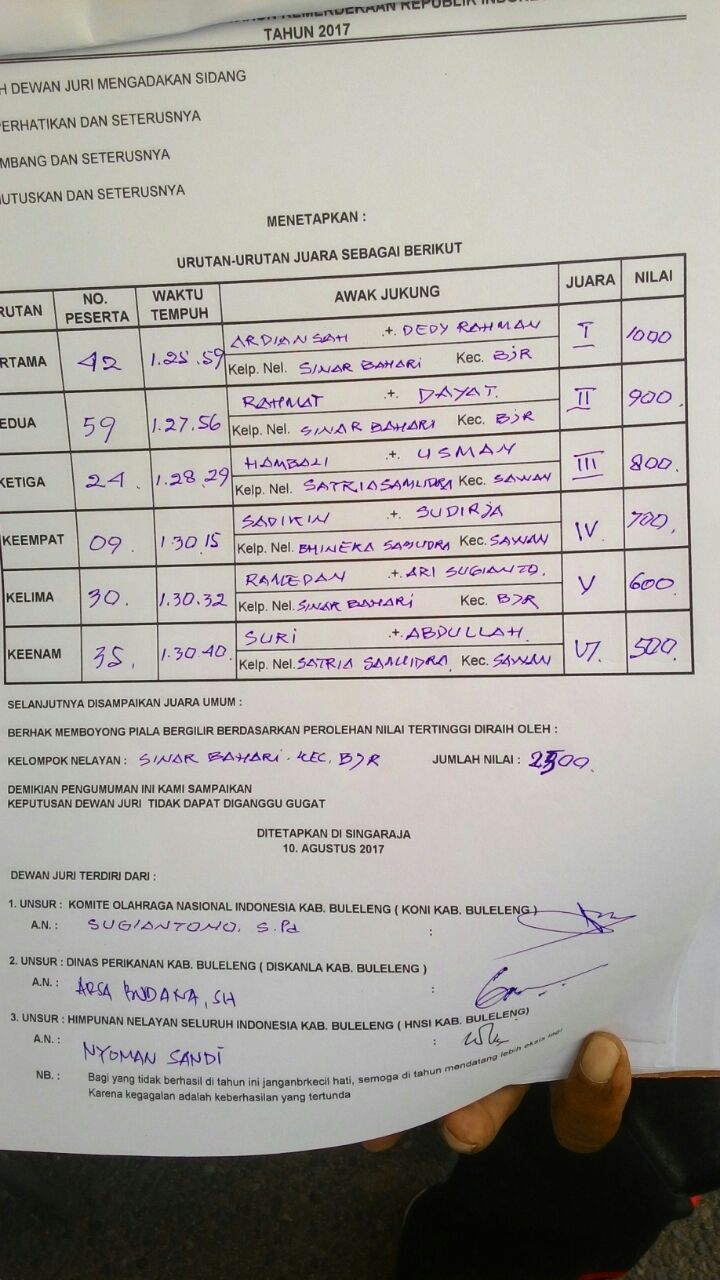 Berikut Pemenang Juara Lomba Perahu Layar yang dilaksanakan pada tanggal 10 Agustus 2017
