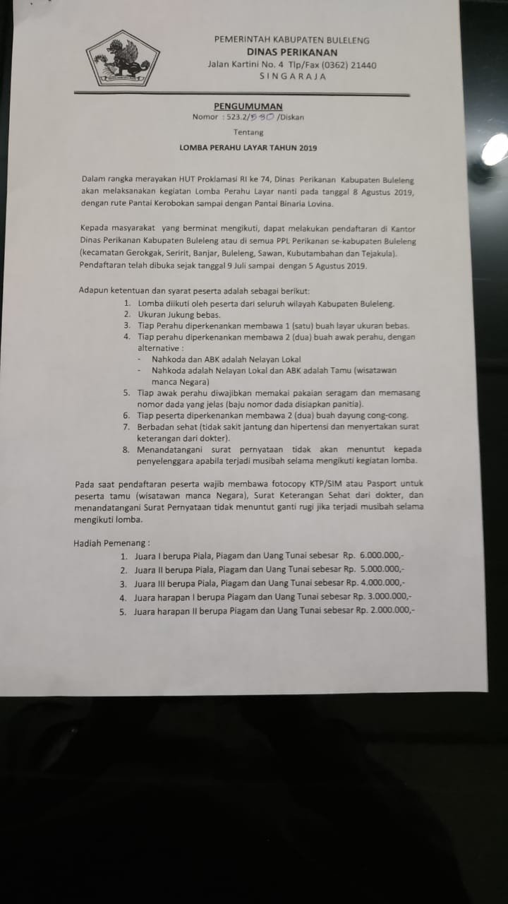 Mohon Ijin Menyampaikan Pengumuman Lomba Perahu Layar Tahun 2019.