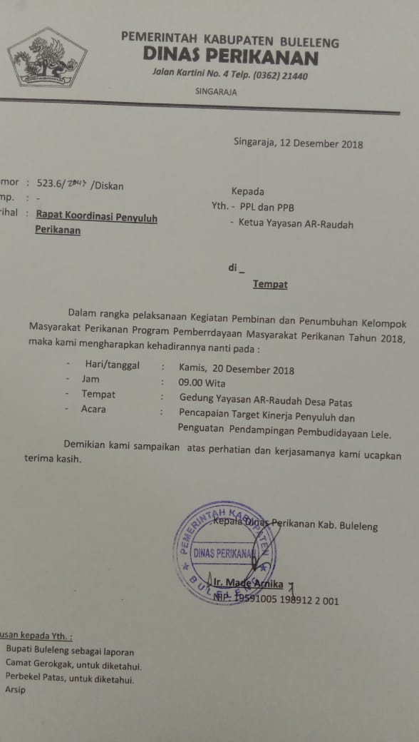 Undangan Rapat Koordinasi Penyuluh Perikanan Kabupaten Buleleng dalam pencapaian target kinerja penyuluh dan penguatan pendampingan pembudidaya lele.
